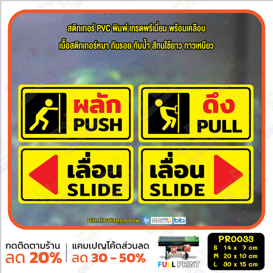 สติ๊กเกอร์ PVC พิมพ์ ผลัก PUSH ดึง PULL เลื่อนซ้าย เลื่อนขวา SLIDE กันน้ำ ทนแดด เคลือบกันรอย(PR0033) สติกเกอร์ ป้ายเตือน